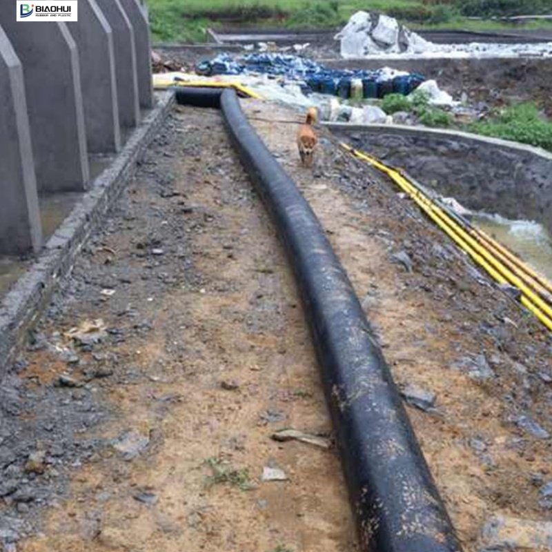 14 inch TPU layflat hose is a super heavy-duty through-the-weave polyurethane (PU) covered hose. The jacket inside the hose shall be made from high tensile synthetic polyester filament yarn,with circular woven method, it will totally be embedded in the PU compound, the covered PU will protect it against mechanical damage, forming a single homogeneous construction without any glues or adhesives of any type between them.Thermoplastic polyurethane (TPU) is extruded “through the weave” in a unique one step production process. This process combined with UV protection additives and ageing-resistant in the compounds makes this transfer hose ideally suited for high abrasion applications in the mining and water transfer/fracking applications.Construction